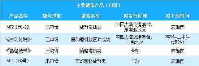 公司有多款储备产品,,涵盖放置类、、、、策略类、、、RPG、、Roguelike等多元化游戏品类,,,储备的主要自研和代理产品如下:::